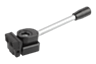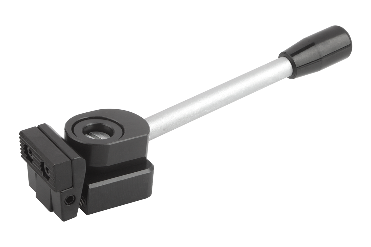 This is a quick-action side clamp where workpieces are clamped by rotating a cam wheel which exerts pressure on the swivel jaw, simultaneously producing a positive down force.