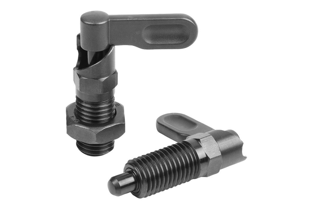 Cam-action indexing plungers are used when the indexing pin should not project all the time. Turning the handle through 180° retracts the pin.