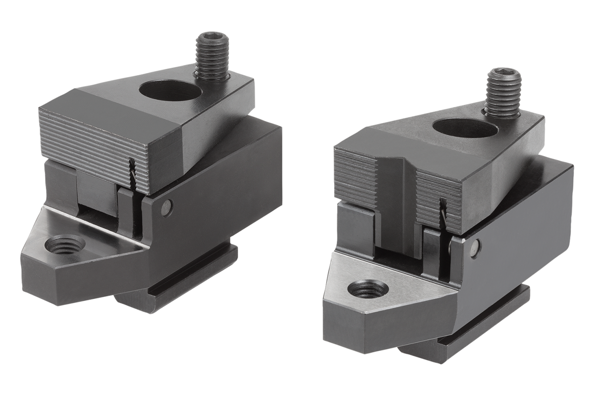 Tightening the ball-end thrust screw moves the jaw plates forwards. The workpiece is pushed against the fixed stop and simultaneously forced down onto the seating face. This side clamp has a ground seating face and tapped hole for adjustable support elements.