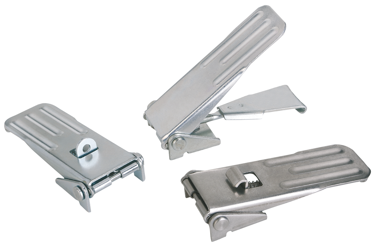 Latches, steel or stainless steel, with adjustable metal plöate hooks for up to 4000N, fastening holes concealed, long version, Style C, with padlock bracket