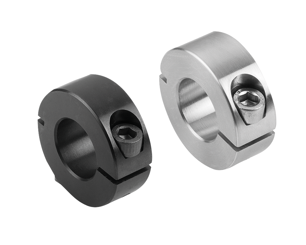 One-piece shaft collars with an outer slit surround the shaft with an equal distribution of the clamping force. This leads to a very precise fit and high retaining force without damaging the shaft.
