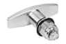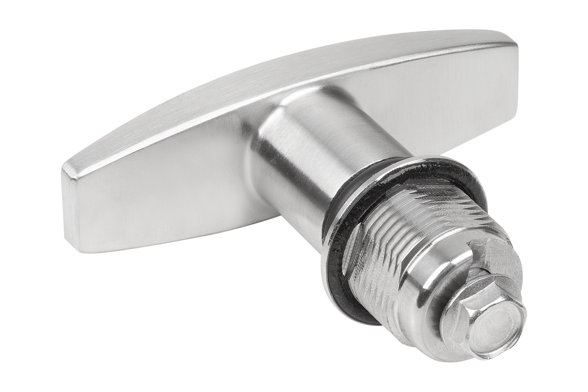Quarter-turn lock with T-grip. For right or left mounting with 90° closing. The quarter-turn lock can be installed pre-assembled. Supplied with standard stainless-steel nut. The lockable quarter-turn lock is supplied with 2 keys. The key can be removed in both the closed and open position. The cylinder locks have a single-key system i.e. the same key works in all locks (lock type 1333).