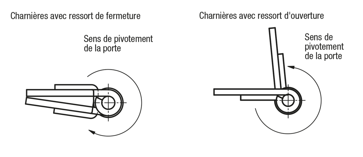 Les charnières sont équipées d'un ressort de tension intégré en acier. Celui-ci permet l'ouverture et la fermeture automatiques des portes et volets.