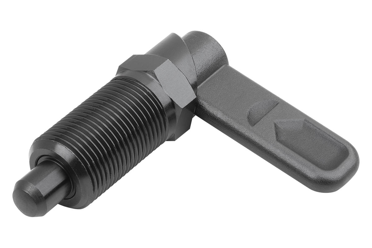 Les doigts d’indexage verrouillables sont utilisés lorsqu'il faut éviter tout déplacement de la position d'arrêt sous l'effet de forces transversales. Une rotation à 180° du verrou entraîne la rétractation du doigt d'arrêt, ce qui permet de modifier la position d'arrêt. L'encoche d’arrêt permet de maintenir le verrou dans cette position et le doigt d'arrêt rétracté.