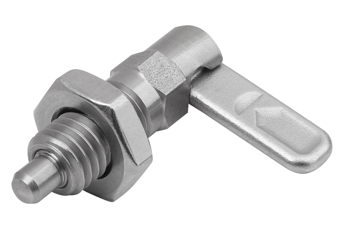 Les doigts d’indexage verrouillables sont utilisés lorsqu'il faut éviter tout déplacement de la position d'arrêt sous l'effet de forces transversales. Une rotation à 180° du verrou entraîne la rétractation du doigt d'arrêt, ce qui permet de modifier la position d'arrêt. L'encoche d’arrêt permet de maintenir le verrou dans cette position et le doigt d'arrêt rétracté.