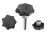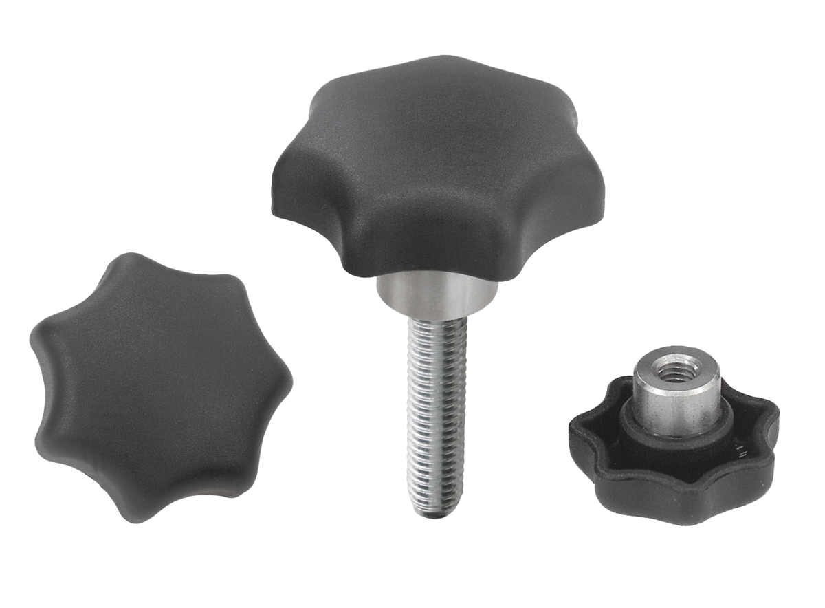 Bouton étoile, forme K, avec douille taraudée saillante en acier