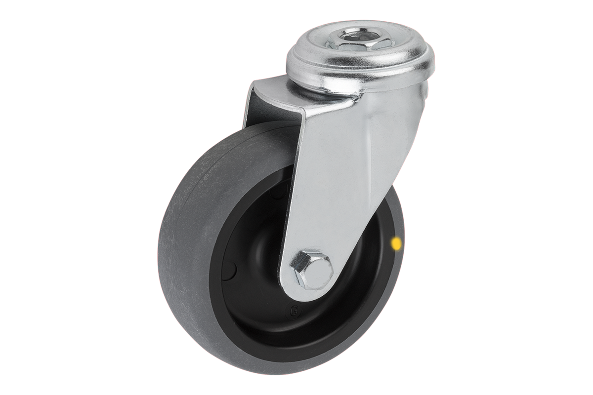 Axe vissé. Roues orientables avec trou de fixation. Bandage conducteur d'électricité lisse, gris. La résistance ohmique de la roue est inférieure à 10⁴ Ω.