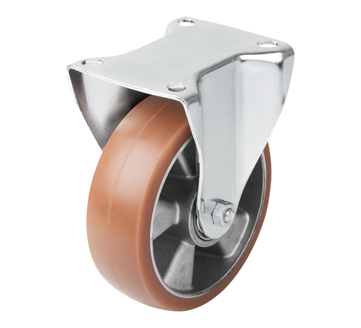 Corps embouti. Corps de roue orientable avec double roulement à billes dans la couronne de pivotement. Roues avec roulement à billes.