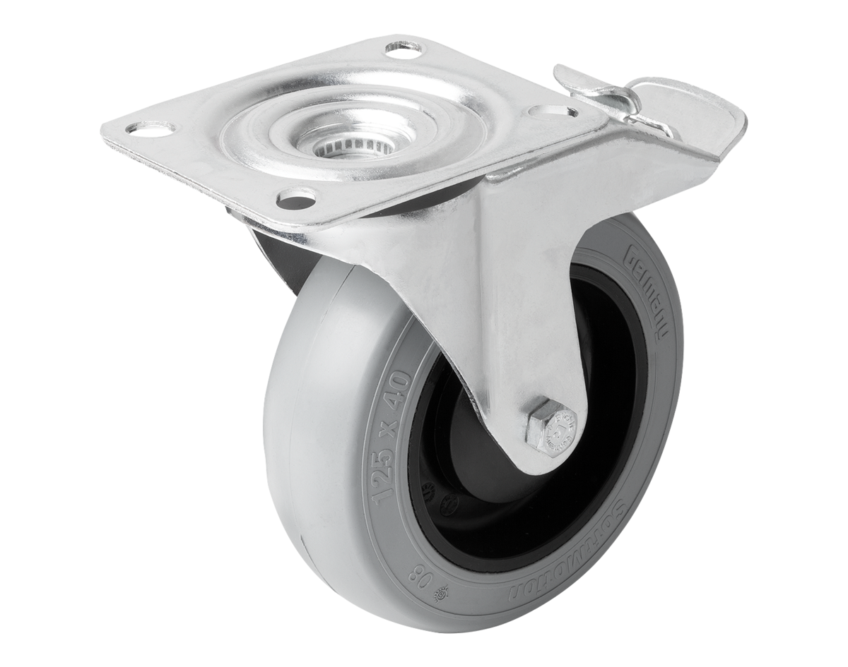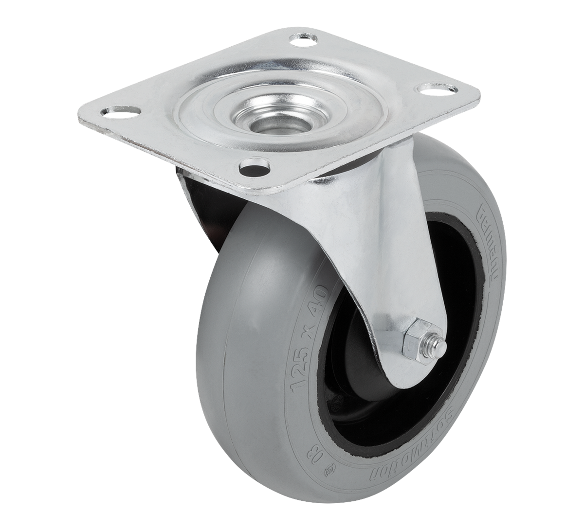 Corps embouti. Corps de roue orientable avec double roulement à billes dans la couronne de pivotement. Roues avec roulement à billes.