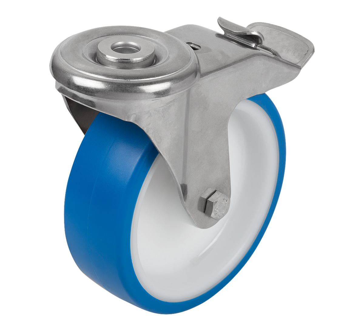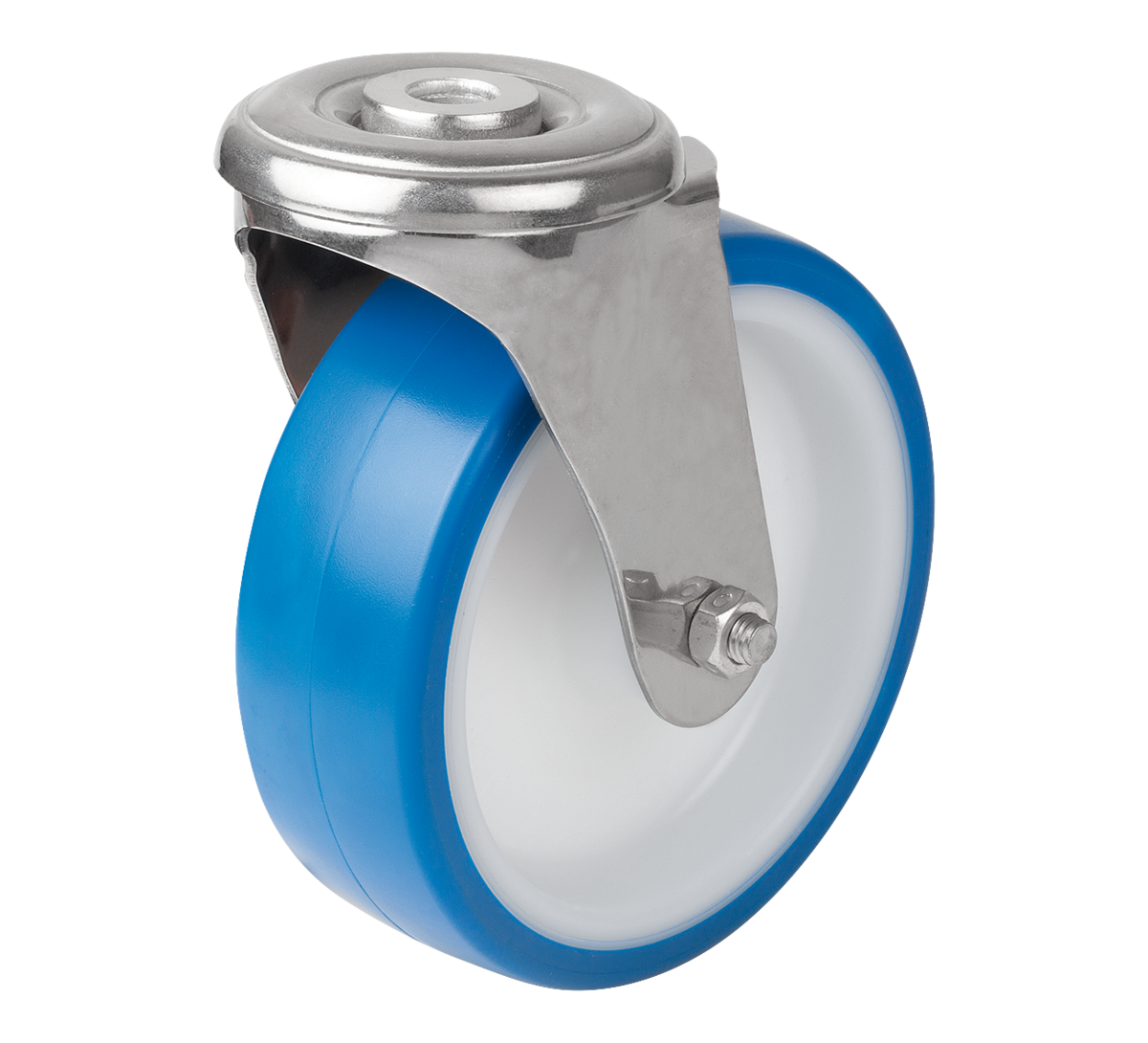 Tôle d’acier : emboutie galvanisée; pivotement sur couronne à double rangée de billes. Roues équipées de paliers lisses.