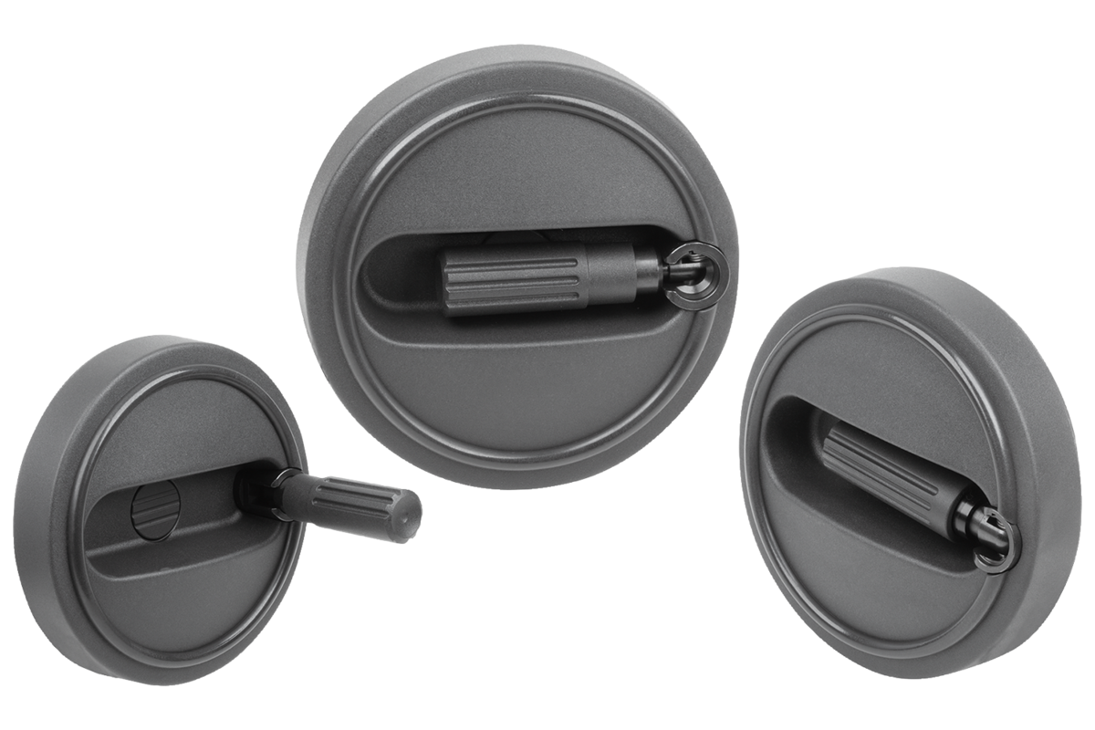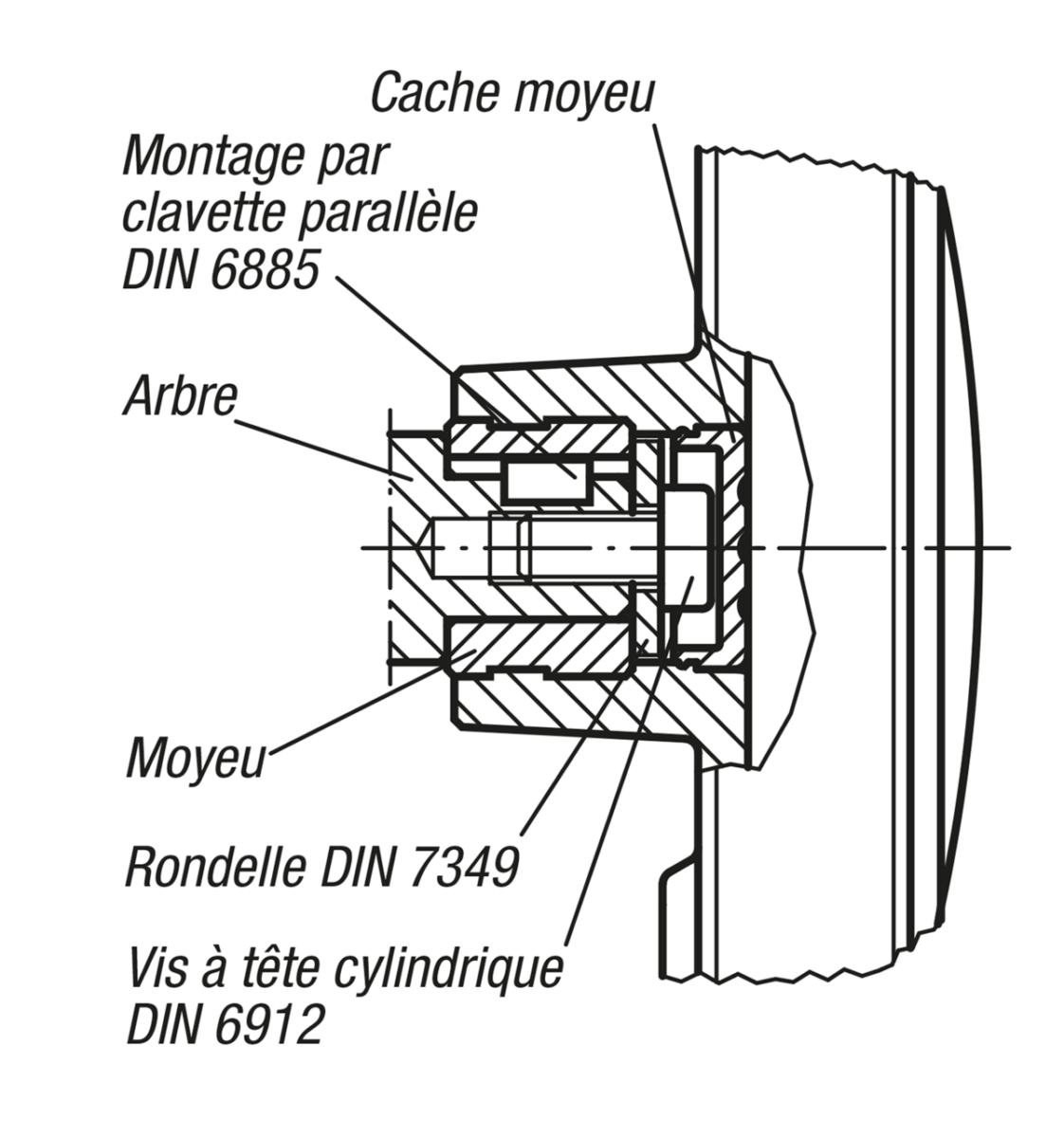 Le cache du moyeu est livré non monté. Les volants se fixent suivant le sens axial sur l’arbre soit à l’aide d'une goupille transversale, soit à l'aide d'une vis à tête cylindrique DIN 6912 et d'une rondelle DIN 7349.