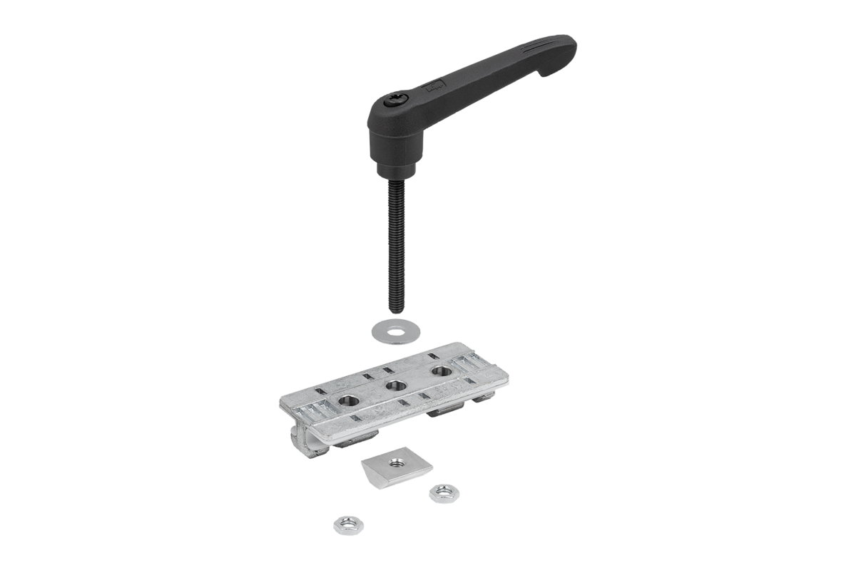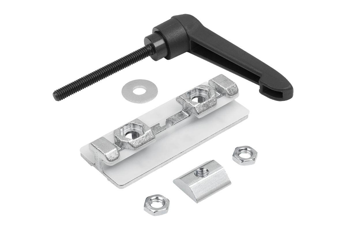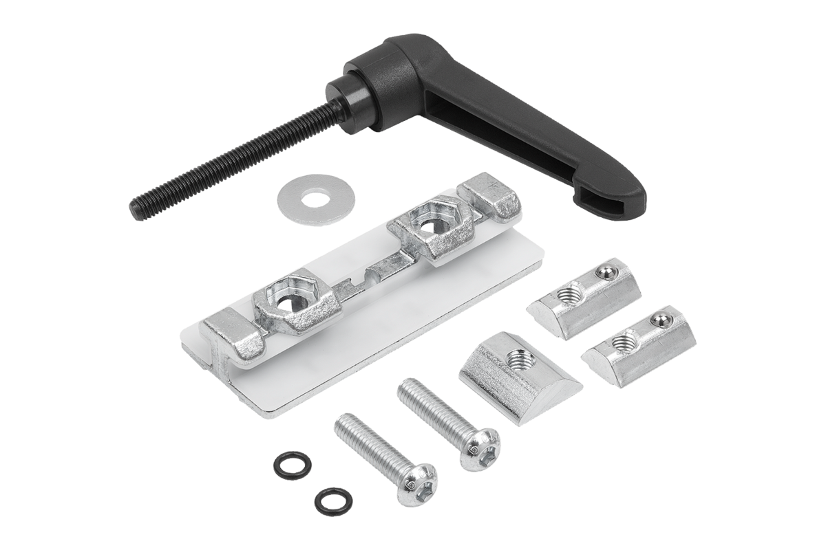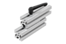 Patins profilés en métal avec éléments coulissants clipsés en plastique. Avec manette indexable supplémentaire pour le serrage du système à chariot. Les patins profilés permettent un déplacement linéaire à faible usure des profilés aluminium de type I avec rainure de 8 mm. Le système est particulièrement insensible à la saleté grâce à l’absence de graissage.