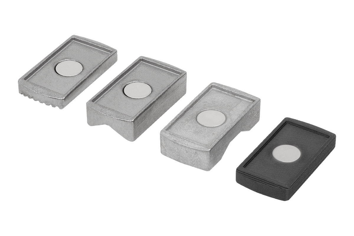 The integrated magnets enable the pads to be quickly and easily added as attachments to the existing thrust pads on the compact power clamp.