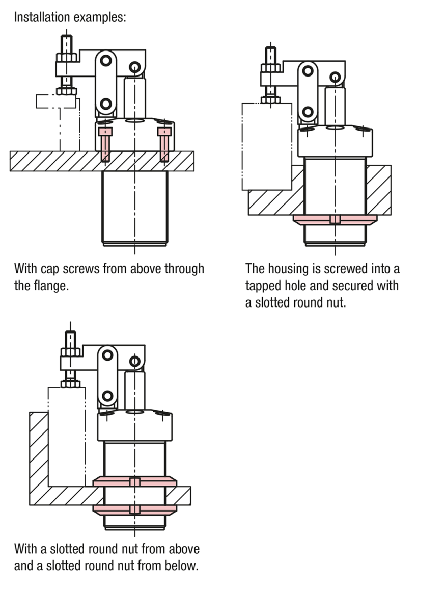 The screw-in link clamp with flange can be fastened from above or below using a DIN 70852 slotted round nut. Another option is to fasten the link clamp to the fixture from above using four cap screws.