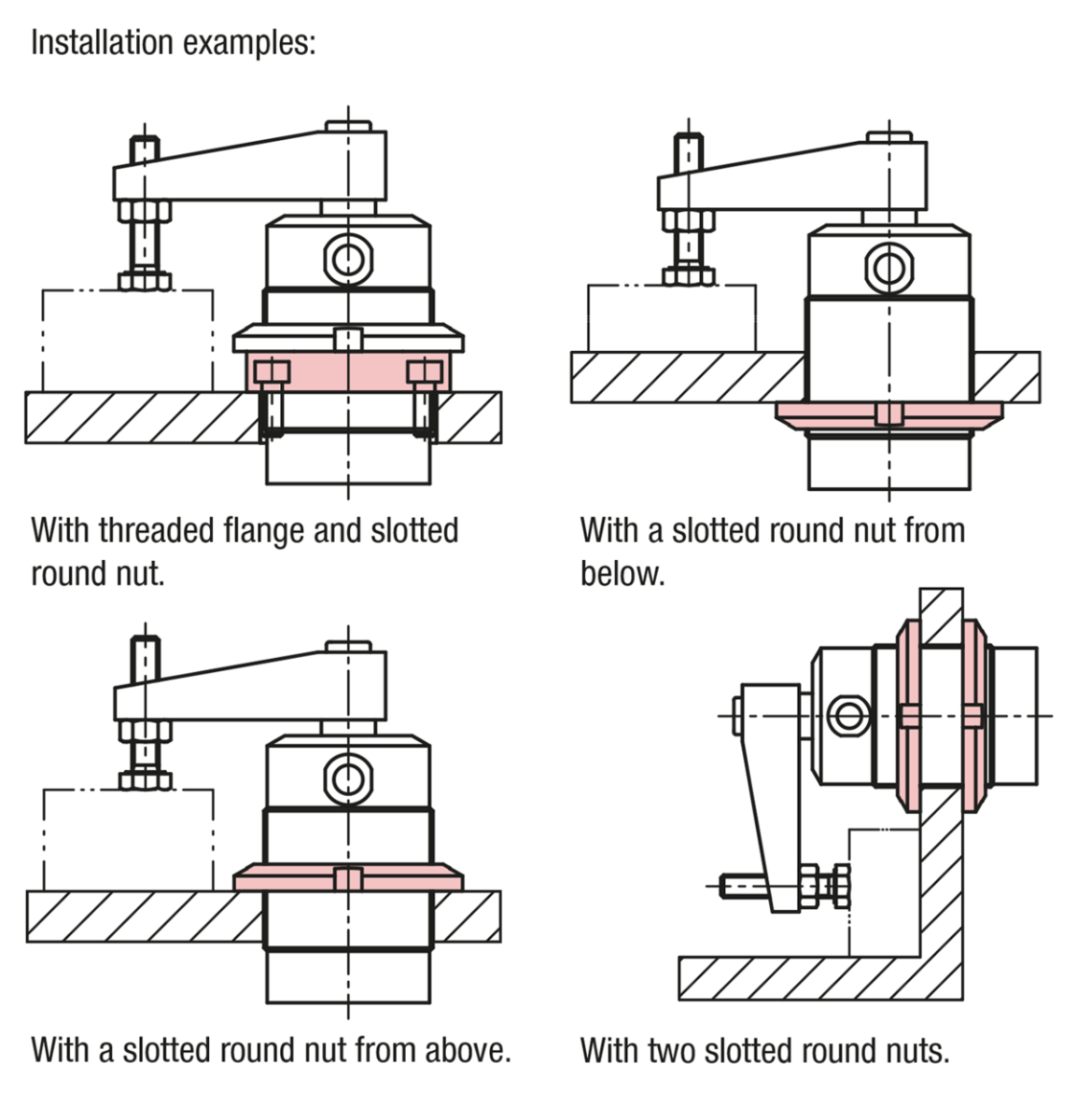 Clamping arm, slotted round nut and threaded flange are not supplied.