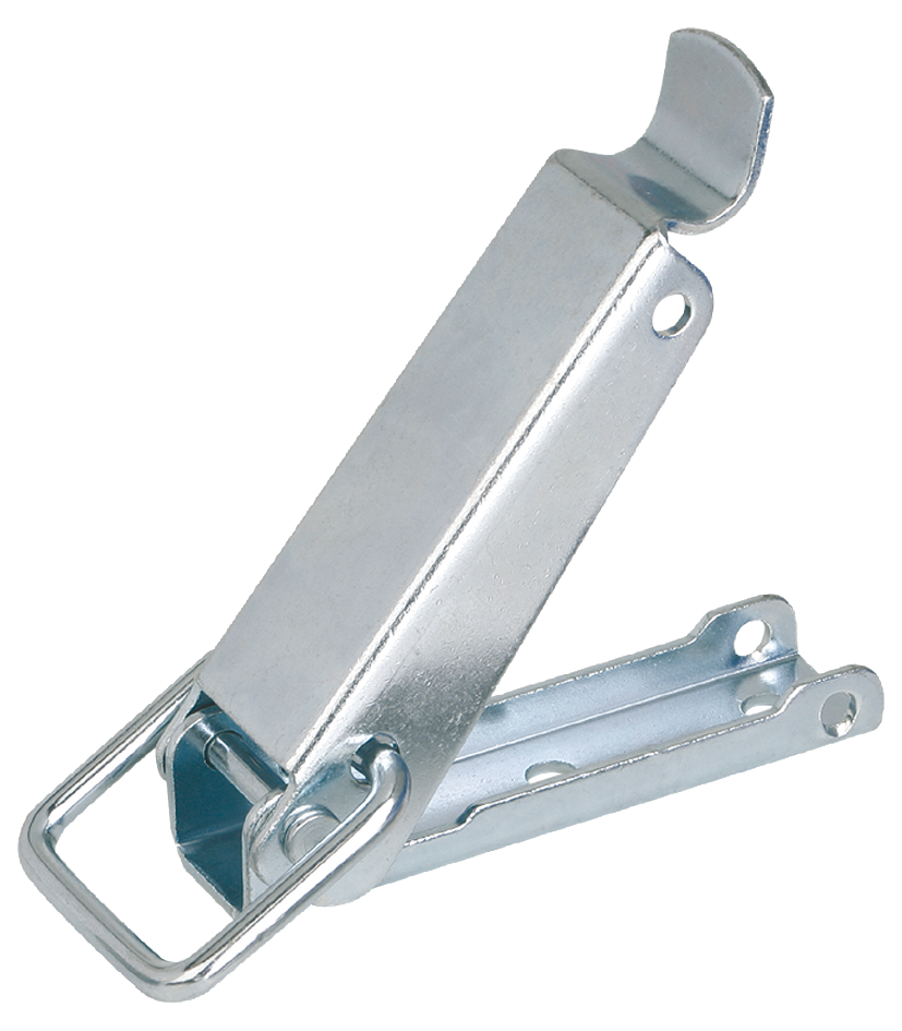 Latches with draw bail for securing and locking hatches, container lids, machine cladding etc. By exceeding the dead center they resist vibration.