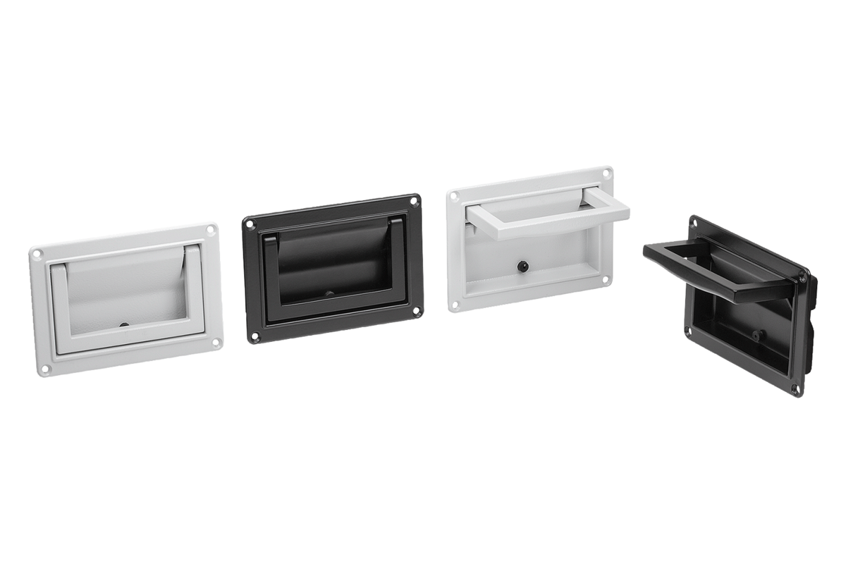 The fold-down recessed handles can be installed from the front or rear of the housing panel with the same housing cutout.