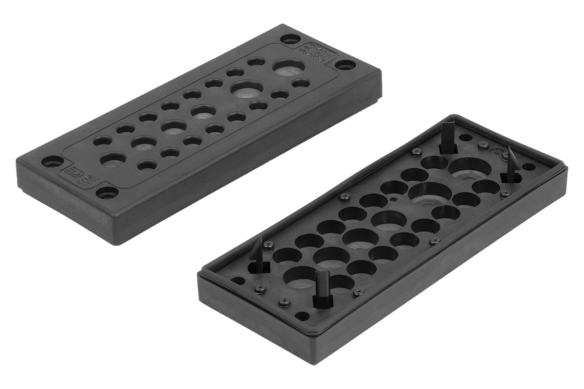 The cable gland plates are suitable for leading through cables without plugs (non-assembled lines). Cables, wires, hoses, pneumatic and hydraulic lines can be routed through.