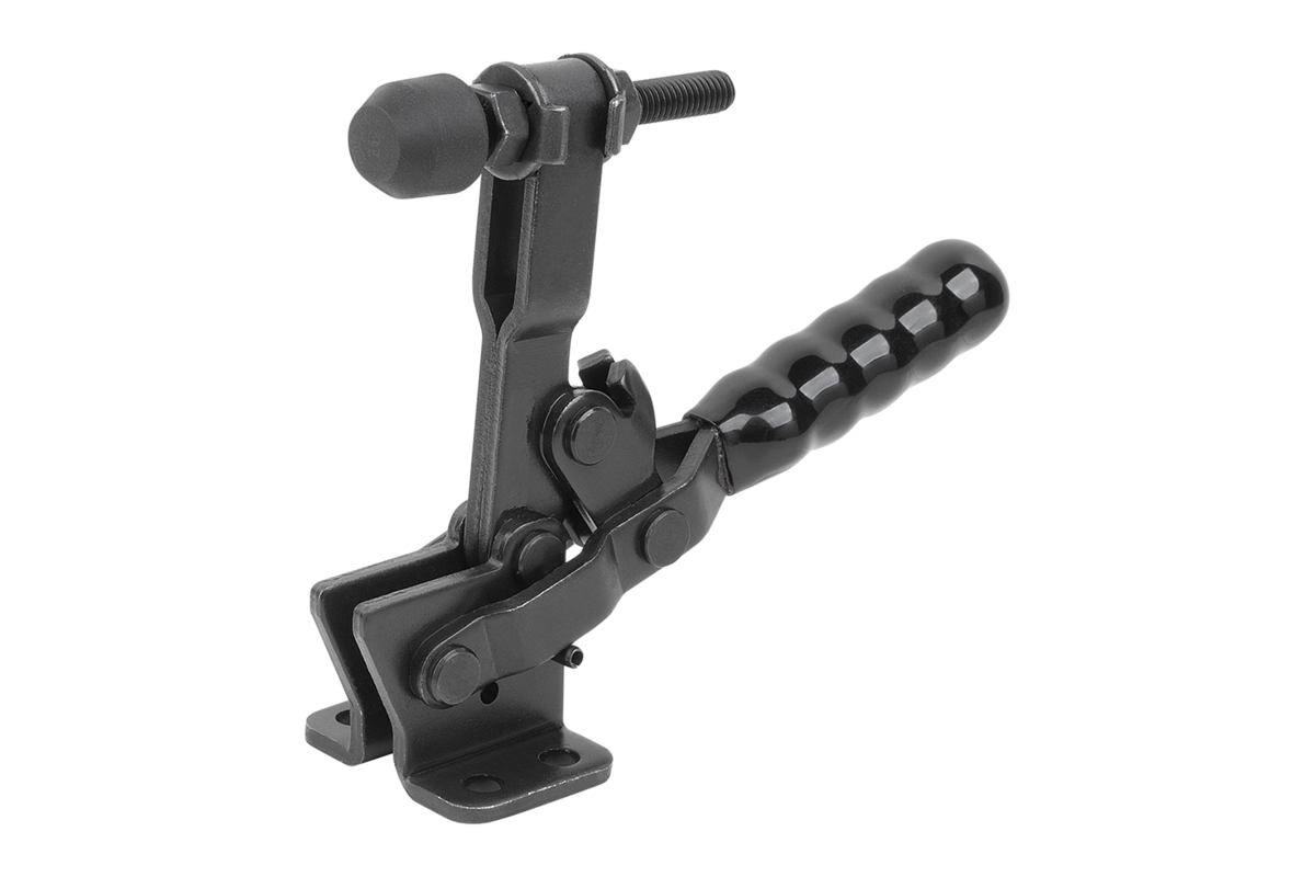 Toggle clamps, steel, black, vertical with horizontal foot and adjustable clamping spindle, style A, small