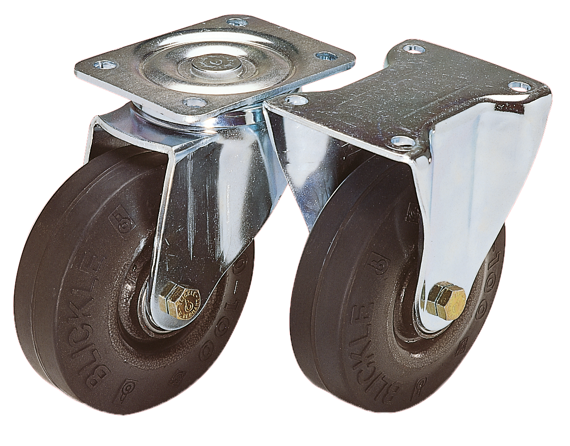 Steel plate fixed castors with steel wire reinforced elastic solid rubber tyres, heavy duty version