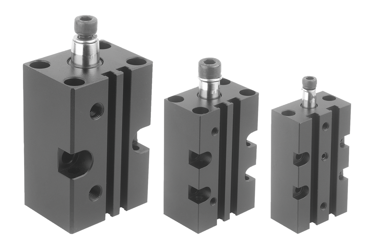 Los dispositivos de sujeción pivotantes se utilizan cuando no se requiere una gran fuerza de sujeción o cuando es necesario que el punto de sujeción esté libre para colocar y retirar la pieza de trabajo. La forma de bloque de la carcasa permite una fijación universal. El pistón magnético está preparado para una detección de fin de carrera eléctrica.