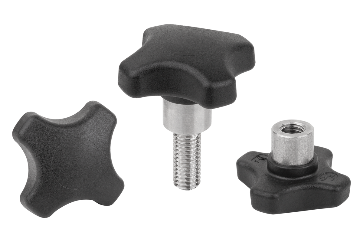 Las empuñaduras en cruz con casquillo de acero saliente en su versión con rosca interior son especialmente adecuadas para uniones con espiga transversal.