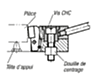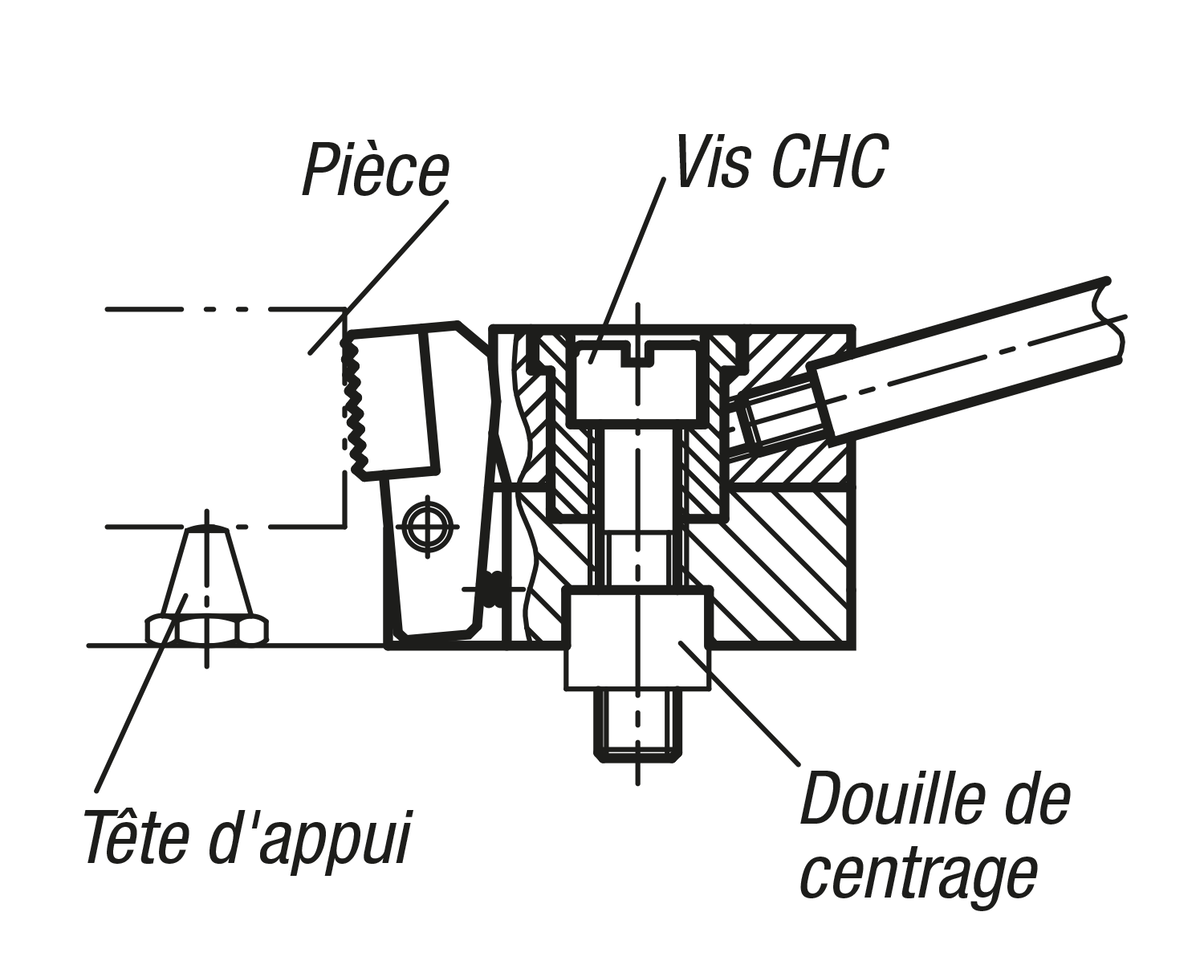 Le crampon plaqueur à came est un élément de serrage rapide, permettant de serrer les pièces à usiner par l’action du levier à came. Le crampon plaqueur à came se positionne et se fixe à l’aide de la douille de centrage (voir schéma).
