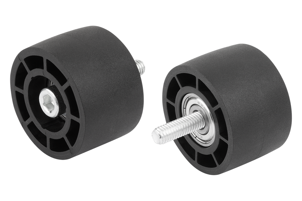 Roulette avec roulement à billes. Pour le guidage de pièces mobiles sur un profil de glissement fixé au profilé aluminium ou pour le guidage latéral de marchandises en cours de déplacement.