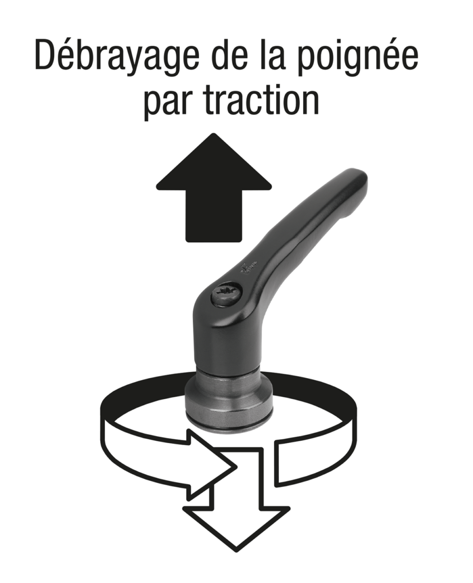 Par ailleurs, ce produit peut également être utilisé par des personnes ayant une force manuelle limitée (par ex. en rééducation) afin d'obtenir des forces de serrage comparables avec moins d'efforts. Une force manuelle plus faible est également nécessaire pour desserrer la manette indexable serrée.