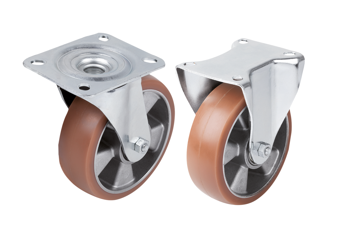 Corps embouti. Corps de roue orientable avec double roulement à billes dans la couronne de pivotement. Roues avec roulement à billes.