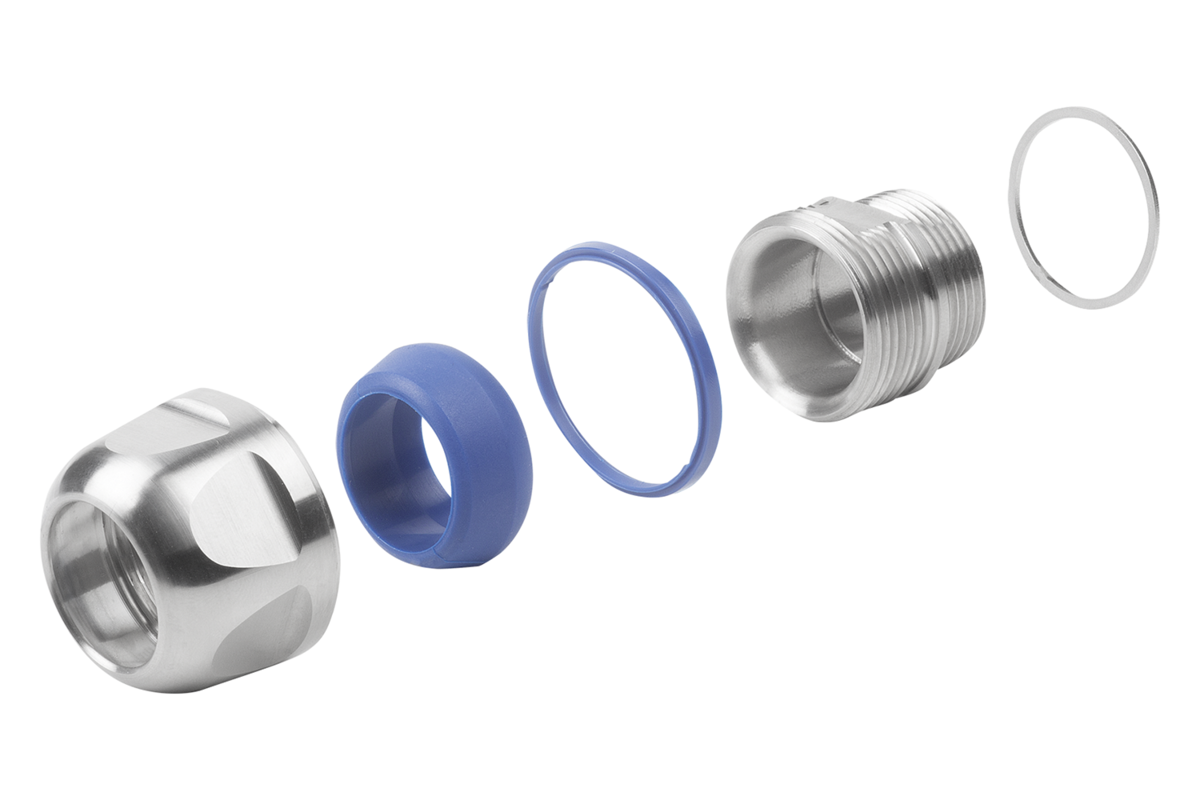 Presse-étoupe en inox : composants externes 1.4404. Composants internes 1.4305.