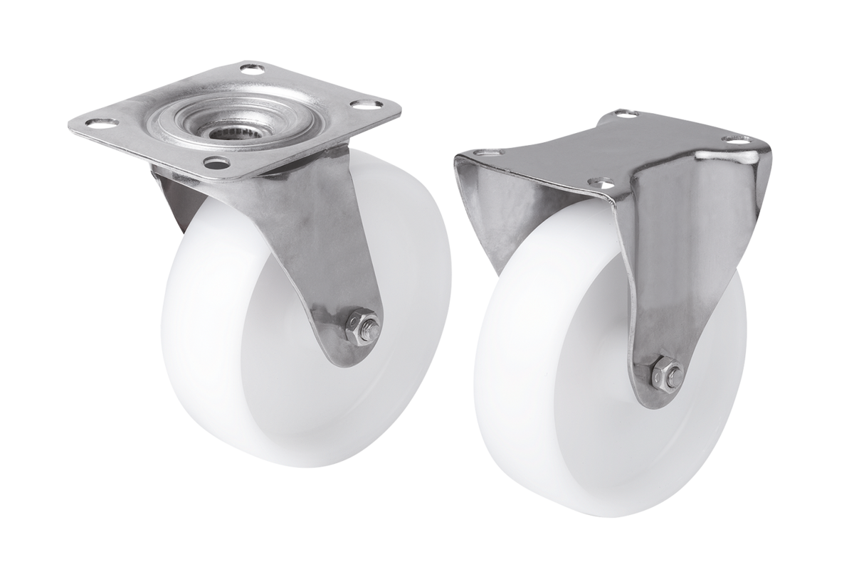 Roulettes fixes en inox avec roue en polyamide, modèle standard