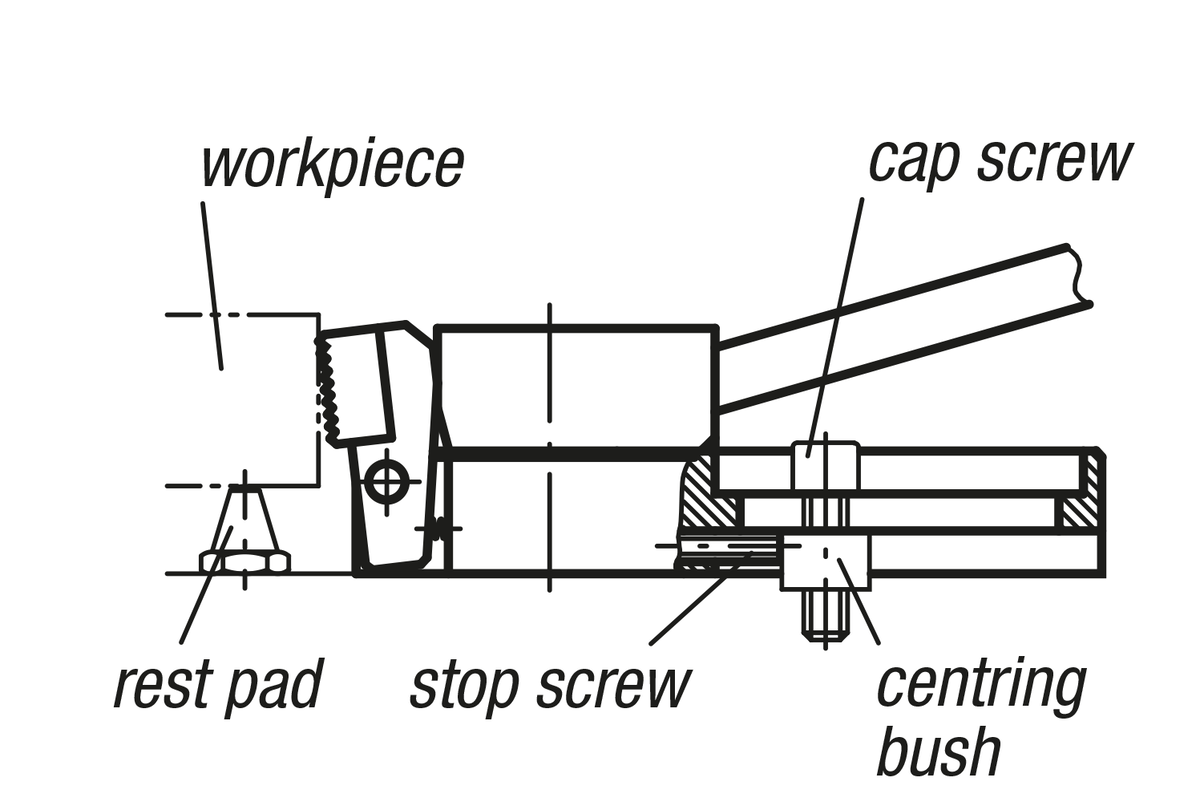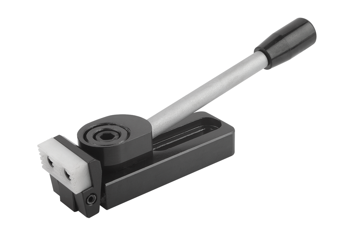 This is a quick-action side clamp where workpieces are clamped by rotating a cam wheel which exerts pressure on the swivel jaw, simultaneously producing a positive down force.