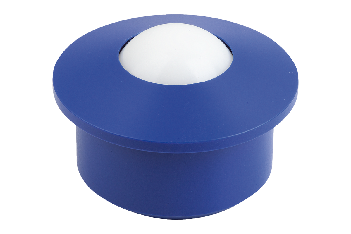 The ball transfer units are made of a certified blue plastic which is suitable for use in the foodstuff sector. The ball transfer units are equipped with a gap-free and sealed cap, which prevents the formation of soiled edges.