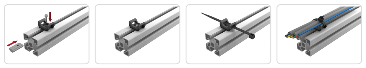 The cable tie block is a fastening component for cables and hoses. Can be mounted on panel elements or aluminum profiles (5 to 12 mm slots) with a cap screw or pan head screw and a slot key.