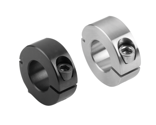 One-piece shaft collars with an outer slit surround the shaft with an equal distribution of the clamping force. This leads to a very precise fit and high retaining force without damaging the shaft.