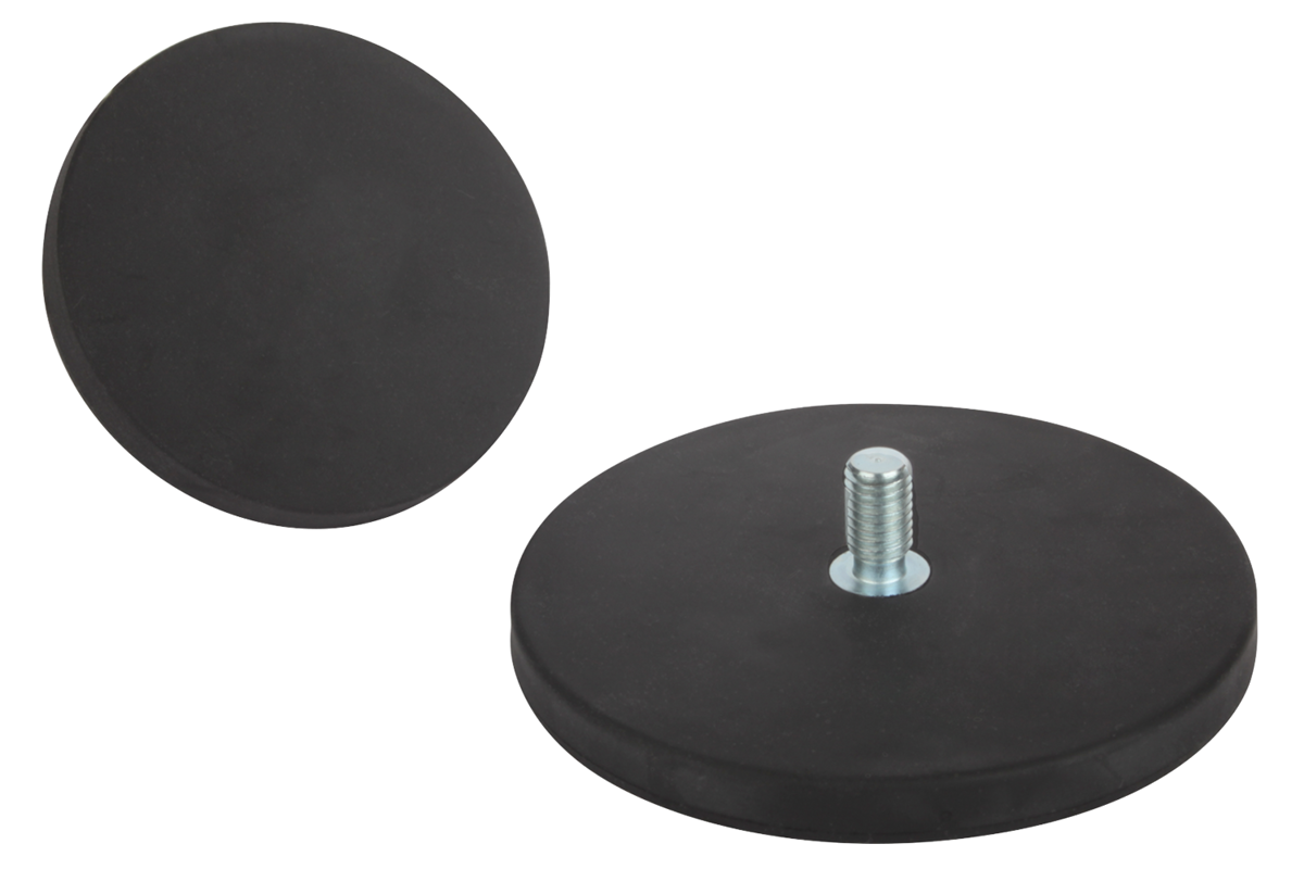 Shallow pot magnets with threaded pin, shielded system. With rubber protective jacket for protecting sensitive surfaces. The coefficient of friction is increased by the rubber jacket, so that high lateral friction is achieved.