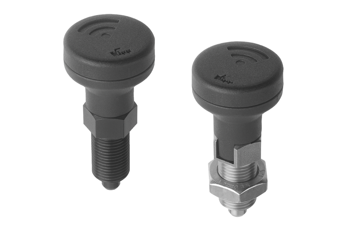 Indexing plungers, steel or stainless steel with status sensor, plastic mushroom grip and locking slot