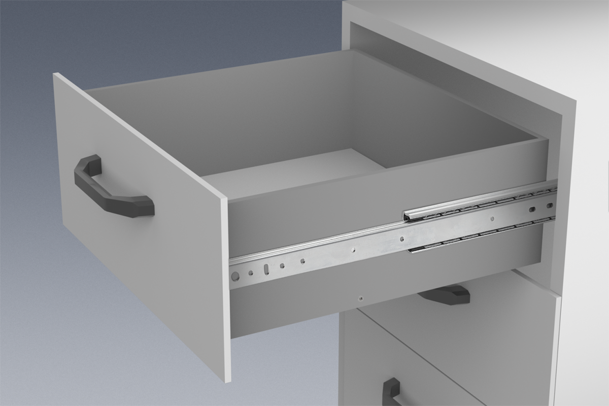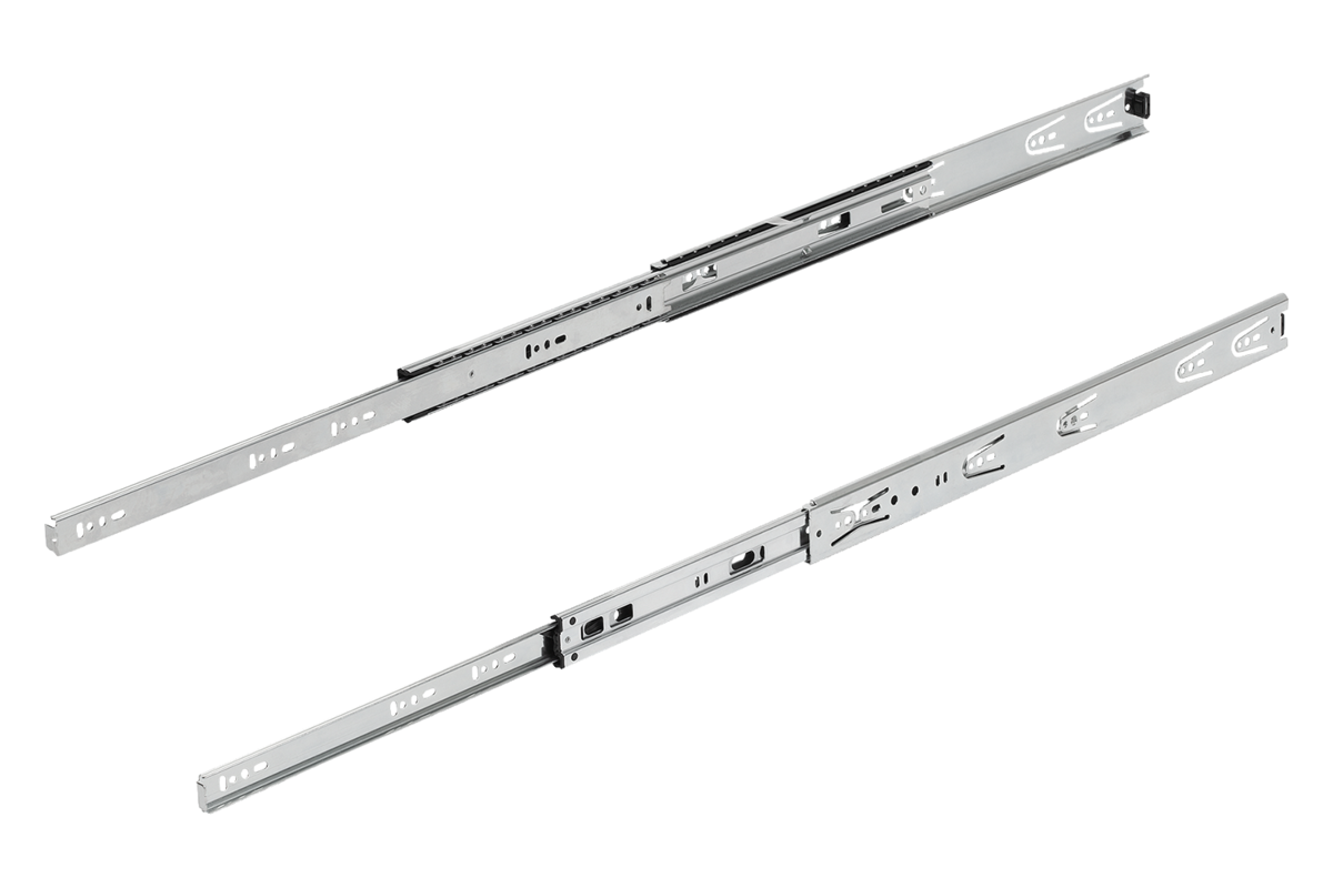 On telescopic slides with full extension, the travel is equal to the installed length, which ensures greater comfort and accessibility. Interlocking in closed position. When the release lever is actuated, the drawer can be taken out easily and separated from the guide.