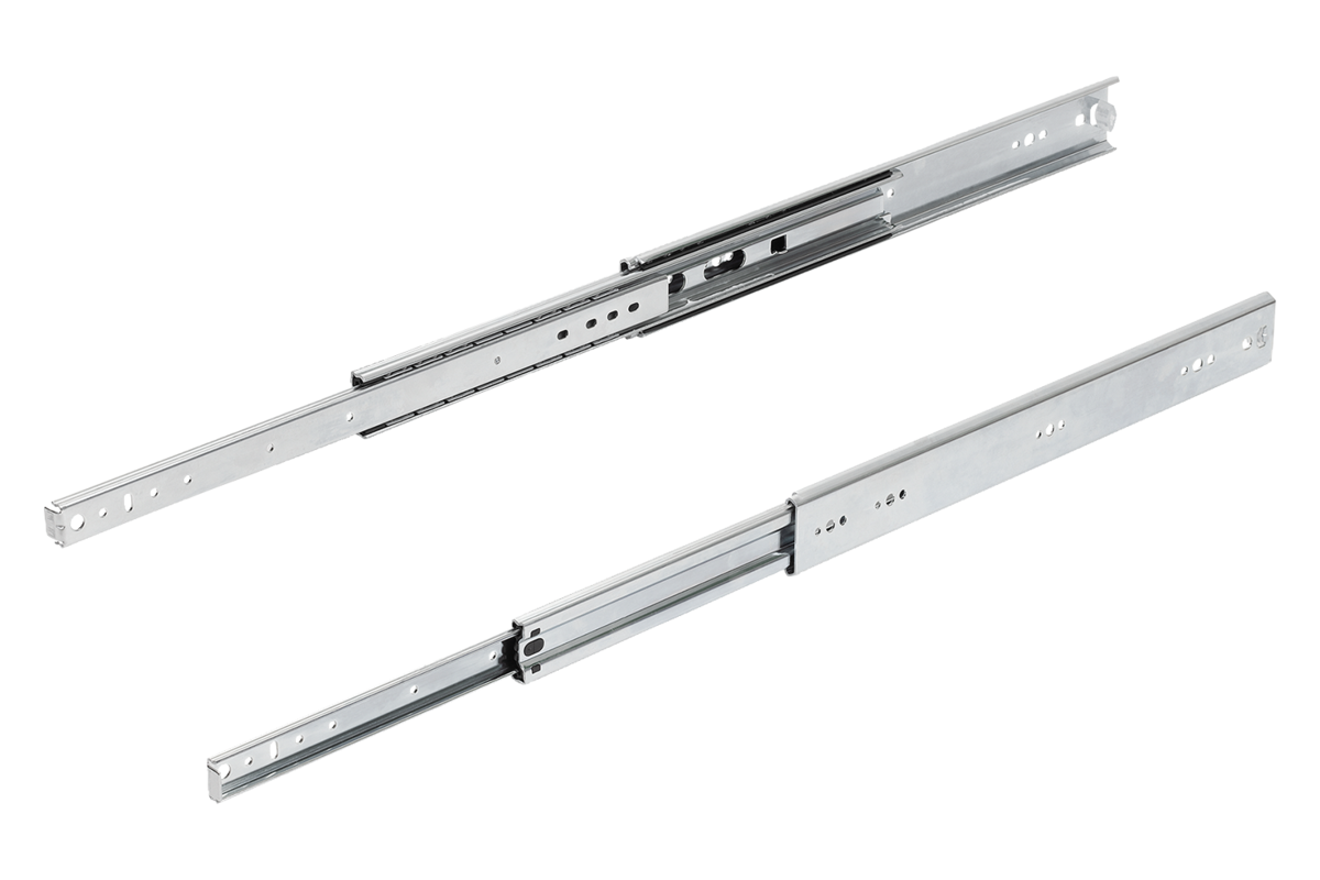 On telescopic slides with over-extension, the travel is greater than the installed length. Interlocking in closed position. When the release lever is actuated, the drawer can be taken out easily and separated from the guide.