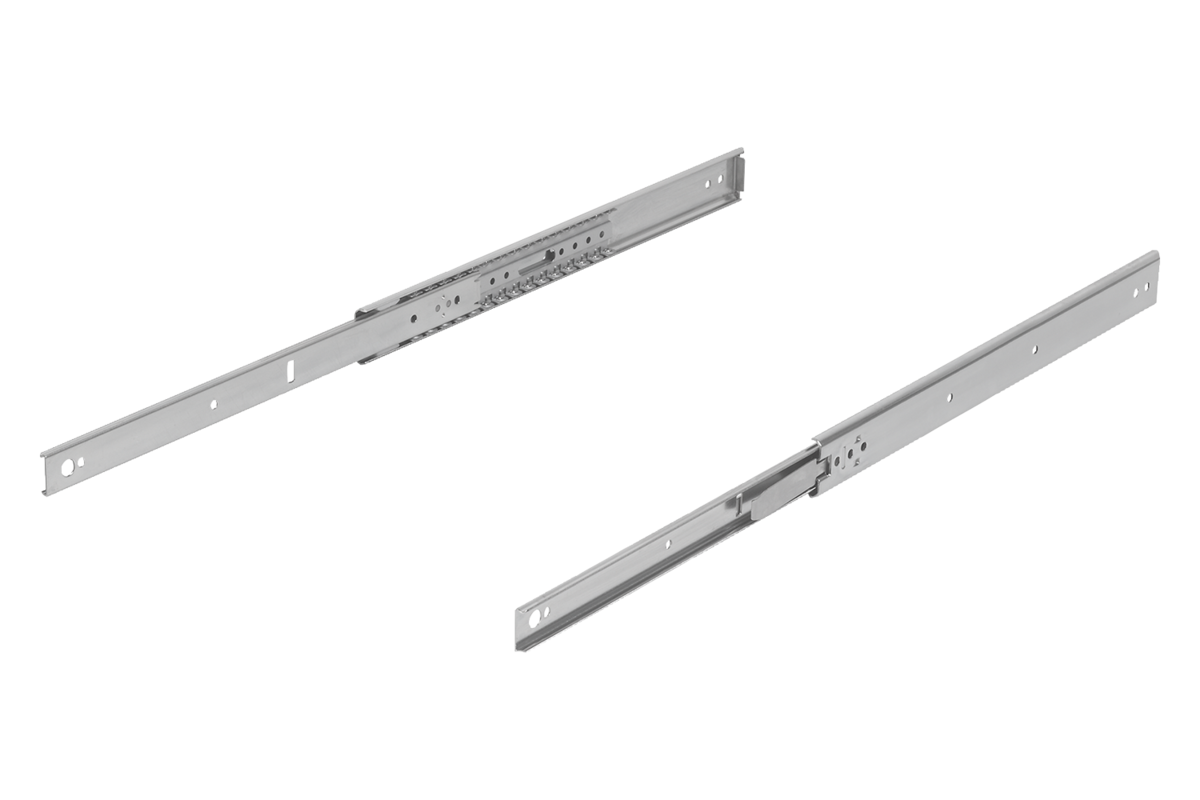 On telescopic slides with partial extension, the travel is less than the installed length. Latches in open position. When the release lever is actuated, the drawer can be taken out easily and separated from the guide.