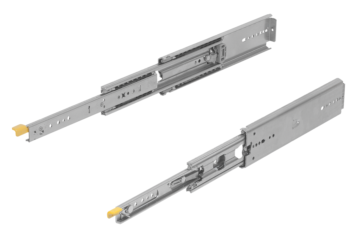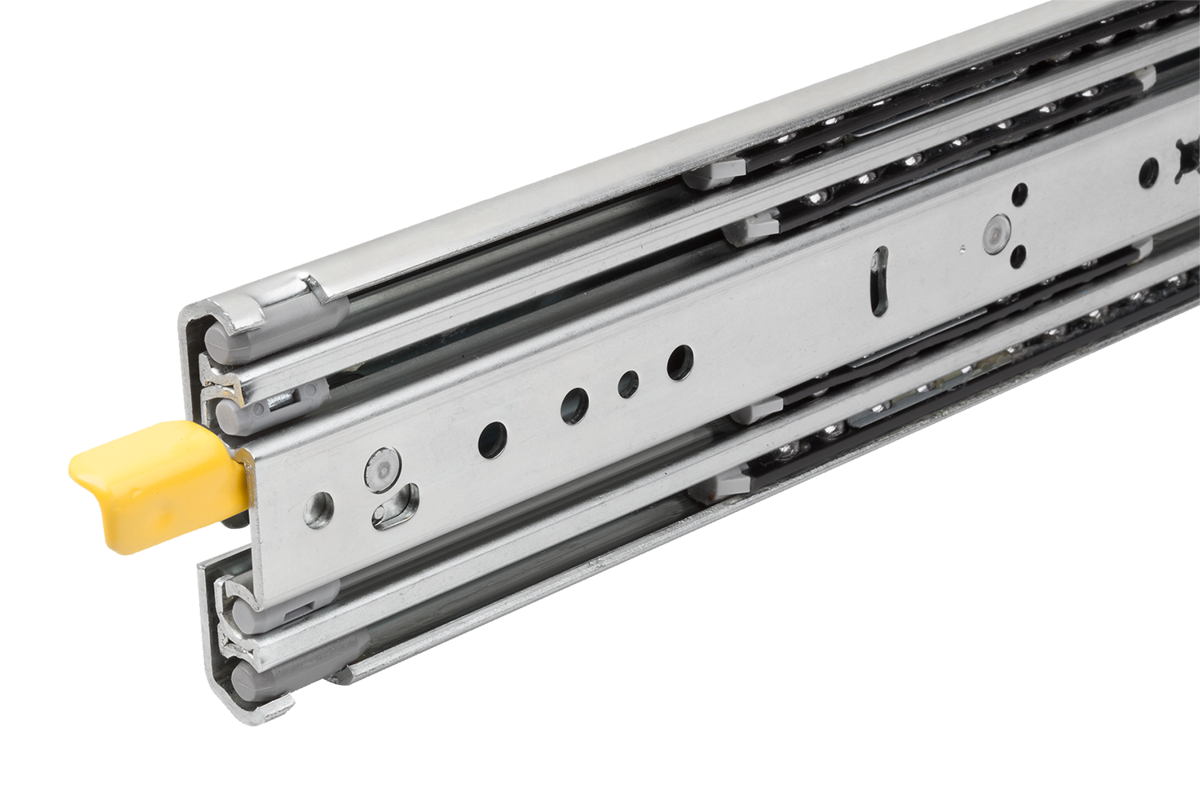 By telescopic slides with full extension, the travel is roughly equal to the installed length, which ensures greater comfort and accessibility. Latches in open and closed positions. The telescopic slides can only be opened or closed after the release lever has been actuated. The dynamic load capacity of the telescopic slides indicates the maximum load rating of a vertically mounted slide pair when the entire extension length is used. The load capacities specified refer to the maximum value for 10,000 cycles.