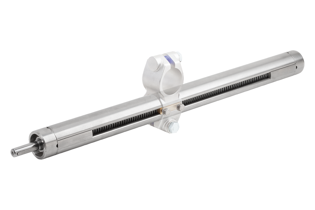 A rotating movement of the threaded spindle is converted into a linear movement of the guide carriage.